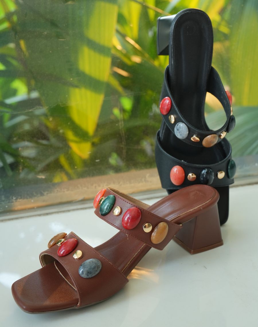 A chic mid heel adorned with two sleek straps and delicate stone accents. Subtle glamour that takes you from day to night with ease.