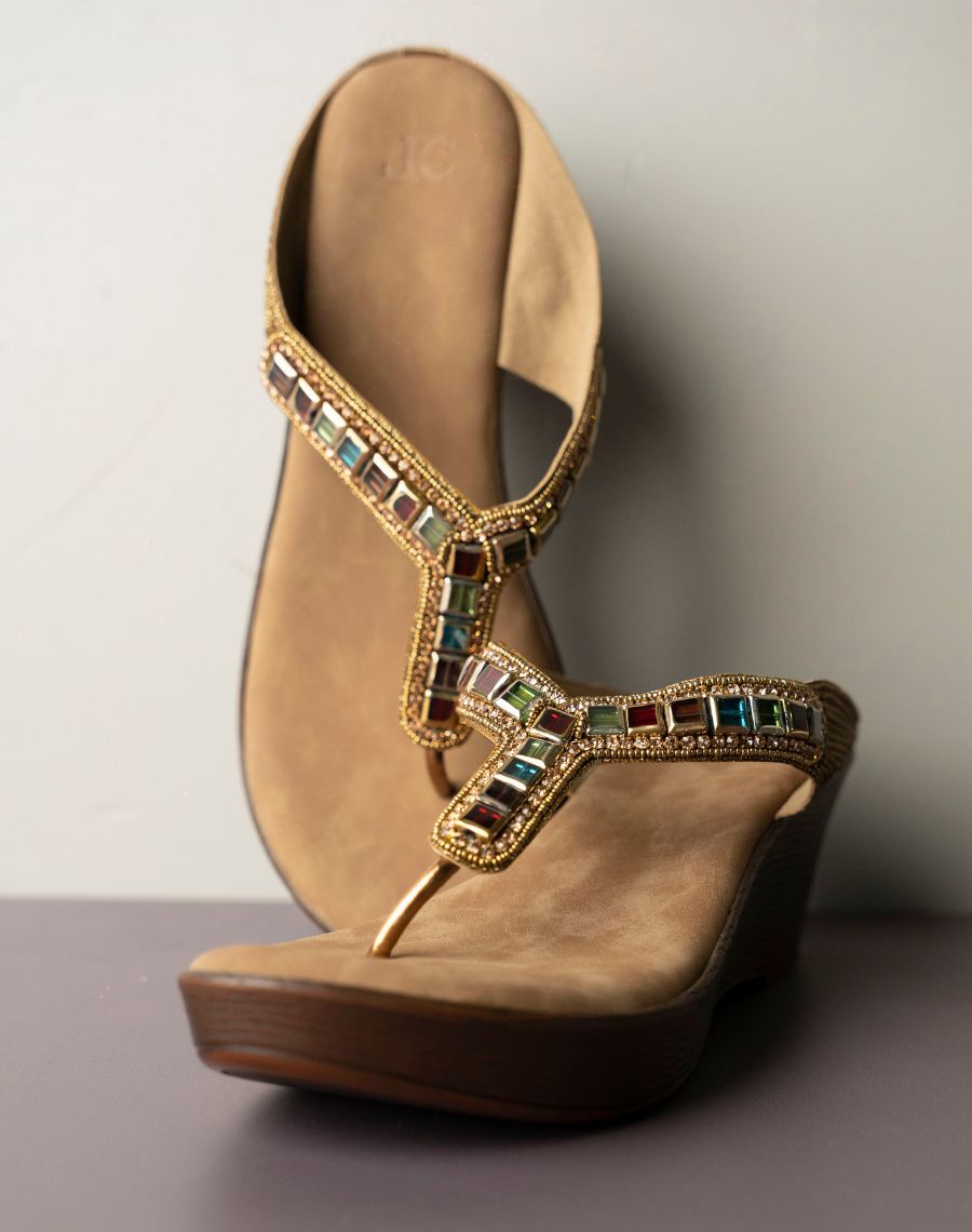 With a cushioned wedge and eye-catching multi-stone detailing, this sandal turns every step into a statement.