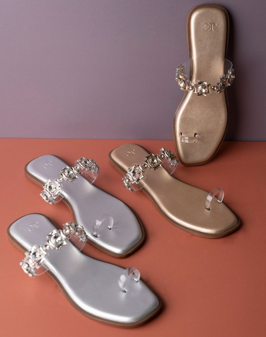 This flat sandal is adorned with clear stones that catch the light just right - effortless sparkle for your everyday step