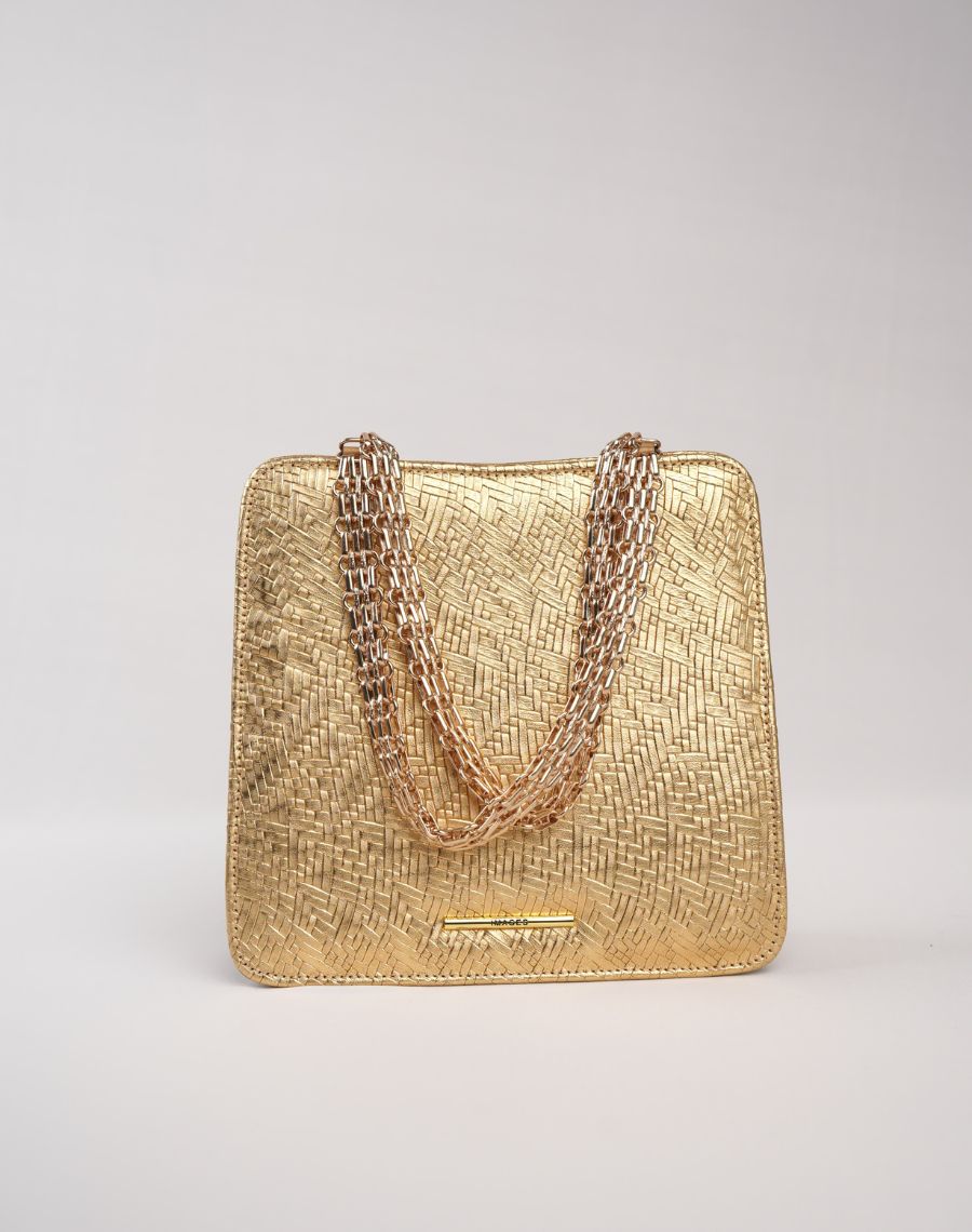 A gold raffia clutch with a chain handle that adds a touch of shine. Lightweight and stylish, ideal for casual outings or evening looks.