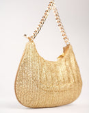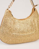 Woven raffia paired with a statement gold chain gives this clutch a polished, effortless look. Light, versatile, and easy to style.