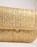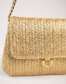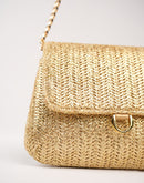 A gold raffia shoulder bag with a flap closure and chain strap that adds a refined touch. Designed to stand out while keeping it elegant and easy to style.