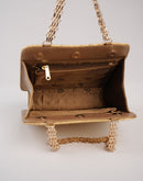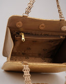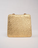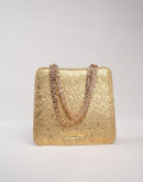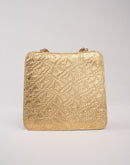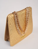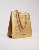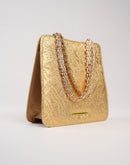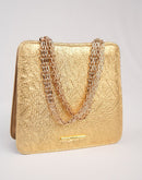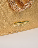 A gold textured clutch with a polished finish and compact design. Adds the right hint of elegance to any outfit.