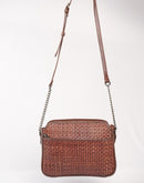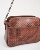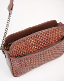 This brown handbag features a smooth leather front and a signature Bottega-textured back, creating a perfect balance of texture and sophistication. Designed with a structured silhouette, it’s a timeless piece that adds understated elegance to any look.