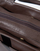 The bag has one main compartment with an interior slip and zip pocket and a laptop compartment. The bag also has a back slip pocket.